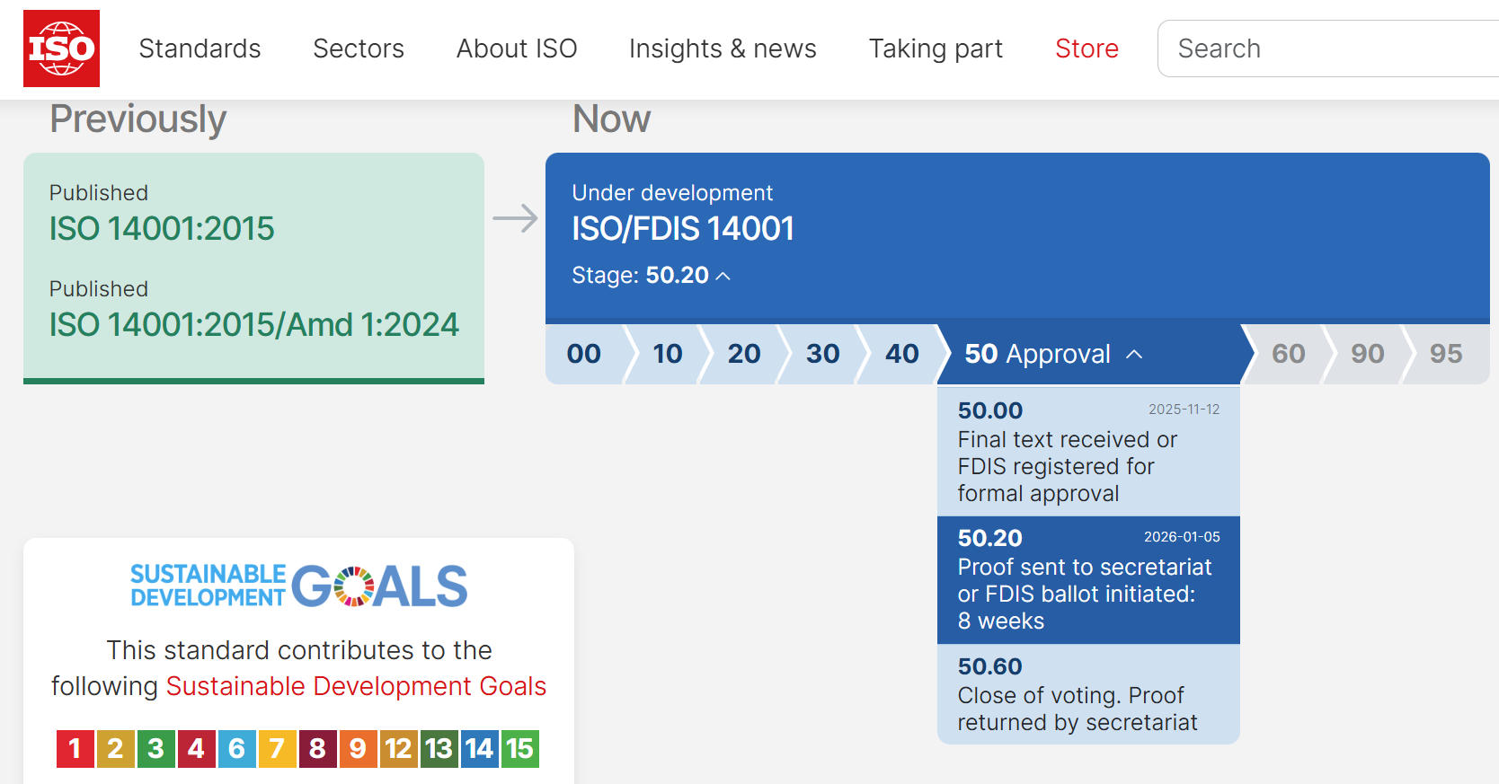 ISO/FDIS 14001是环境管理体系(EMS)的最终国际标准草案,目前正处于批准阶段,这意味着最终文本将提交给全球ISO成员进行投票。预计将于2026年4月取代ISO 14001:2015,新版本加强了最重要的内容:环境保护和业务成果。更新后的标准使世界各地的组织能够提高绩效、削减成本并保持合规性,同时建立信誉,为地球带来切实的改变。